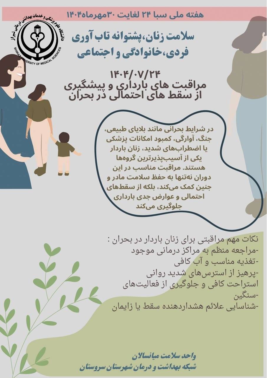 شبکه بهداشت و درمان شهرستان سروستان هفته ملی سلامت زنان ایرانی ۲۴ تا ۳۰ مهر ۱۴۰۴-مراقبت های بارداری و پیشگیری از سقط های احتمالی در بحران گروه خبری : اخبار,پیام سلامت کد خبری : 135259 کپی کلیدواژه